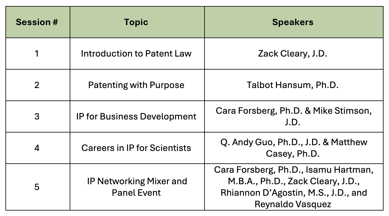 The Biotechnology Club at UT Southwestern is offering a 5-part patent law course in collaboration with Norton Rose Fulbright US LLP and the UT Southwestern Innovation Hub. All UT Southwestern trainees, staff, and faculty are welcome to apply for the course. Applications open in January, and the course starts in mid-February. Participants learn the basics of patent law as it pertains to biomedical research and business development for scientists. No prior experience with patent law is required! Those who attend 4 out of the 5 sessions earn a certificate of training.