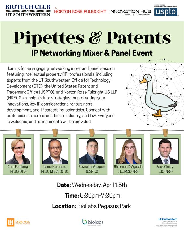 The final session of the patent law course will be open to everyone interested in science, law, and industry. This session is sponsored by BioLabs Pegasus Park in collaboration with Norton Rose Fulbright, the UT Southwestern Innovation Hub, and the United States Patent and Trademark Office. Attendees have the opportunity to network with professionals in IP law, industry, and academia. The panel session offers key insights into IP for business development in biotech, patents for academic research, and IP careers for scientists.